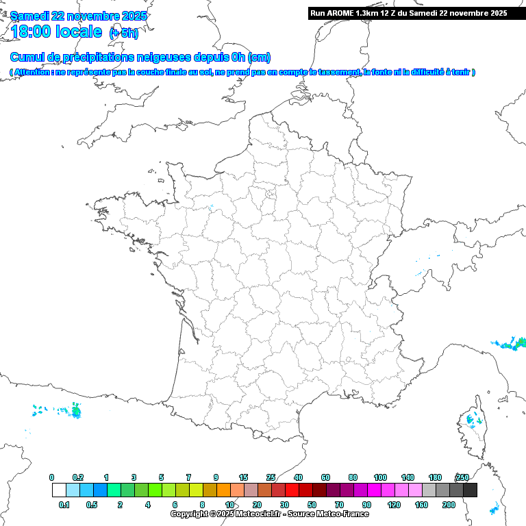 Évolution de l'épaisseur de neige au sol prévue par le modèle météo ARÔME entre samedi 17h et dimanche 11h - METEOCIEL