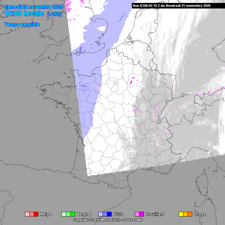 Après minuit et jusqu’en fin de nuit, les chutes de neige s’étendront à l’orléanais, à la Champagne, à une partie de la Bourgogne et au Massif central où des inversions de température pourraient entraîner des pluies verglaçantes.  De plus, il n’est pas exclu qu’un épisode de pluies verglaçantes touche également une partie des régions du nord-est, ainsi que la Bourgogne et éventuellement le Centre.