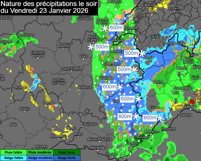 Lorsqu'elle atteindra les régions alpines en fin de journée du vendredi 23 janvier 2026, la perturbation s'accompagnera d'un effet d'isothermie qui fera baisser assez nettement la limite pluie/neige. Ainsi, la neige devrait descendre en basse montagne en soirée de vendredi. Selon les dernières modélisations, la limite pluie/neige se situerait vers 500-600 mètres dans le nord des Alpes et plutôt 800-900 mètres sur le sud de la chaîne. Évidemment, cela dépendra de l'intensité des précipitations et ces prévisions devront être affinées d'ici là.