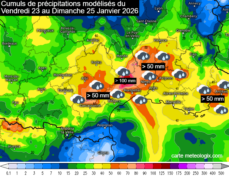 Une nouvelle séquence agitée se profile pour le sud de la France. Une première perturbation arrosera le quart sud-est durant la journée du vendredi 23 janvier 2026 puis un nouveau front pluvieux gagnera l'Occitanie puis le Massif Central et PACA en journée du samedi 24 janvier. Les précipitations faibliront progressivement le dimanche 25 janvier. En cette fin de semaine, les cumuls de précipitations dépasseront fréquemment les 50 mm du sud du Massif Central à la moyenne vallée du Rhône et vers la côte d'Azur. Dans les Cévennes, il pourra tomber plus de 100 mm.