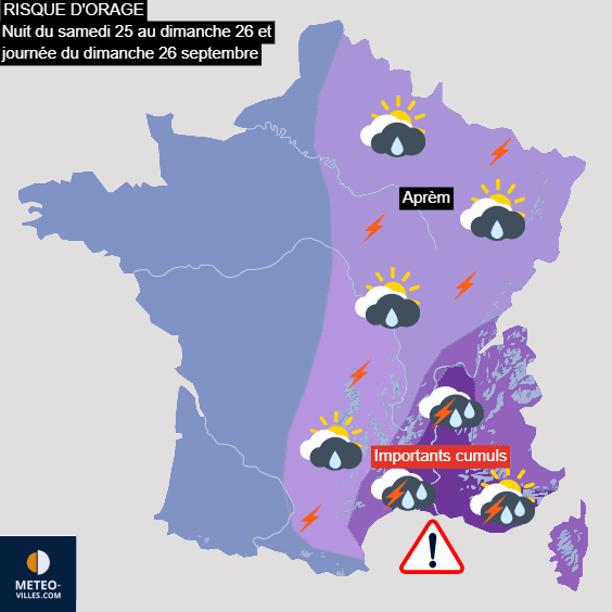 C'est donc entre la fin de journée de samedi 25 et la fin de journée du dimanche 26 septembre que la situation se montrera la plus instable sur le Sud et notamment le Sud-Est du pays. Le risque d'orages très pluvieux n'est pas négligeable, notamment entre la vallée du Rhône et le littoraux méditerranéens en raison d'une forte teneur en eau précipitable de l'atmosphère mais également d'une instabilité marquée pour la période près de la Méditerranée.