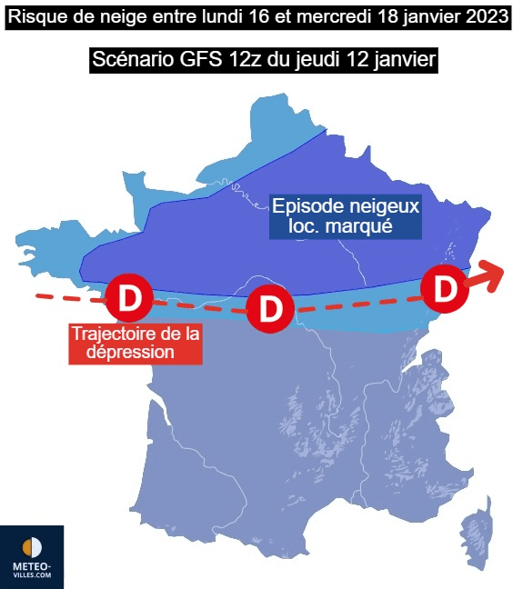 C'est en tout cas le scénario envisagé par certains modèles de prévision ce vendredi. Une dépression assez creuse pourrait en effet se former sur l'Atlantique entre lundi 16 et mercredi 18 et circuler d'Ouest en Est, induisant un risque d'épisode neigeux potentiellement marqué jusqu'en plaine au nord de celle-ci (air plus humide et afflux d'air froid plus marqué). Selon les scénarios de ce vendredi 13 janvier, cette dépression circulerait sur le Sud de la France, induisant donc un épisode neigeux jusqu'en plaine entre le Massif-Central, le Centre-Est et le Nord-Est du pays.