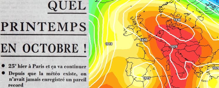 Il ne faut pas remonter bien loin pour retrouver un épisode de chaleur au cours d'un mois d'octobre. Pas plus tard qu'en 2019, des conditions estivales ont concerné la France du 11 au 14 du mois. Le dimanche 13 octobre fut la journée la plus chaude de l'épisode avec des températures maximales de 27,5°C à Strasbourg, 29,1°C à Bourges, 30,4°C à Bordeaux et 32,1°C à Mont-de-Marsan !