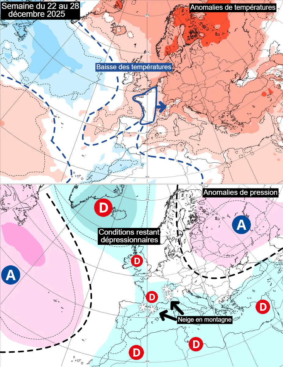Anomalies de températures et de pressions pour la semaine du 22 au 28 décembre en France – ECMWF