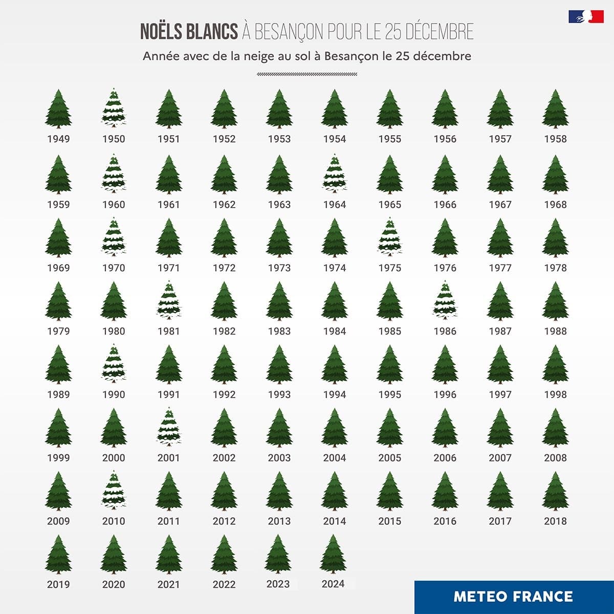 Néanmoins, il est important de noter que les Noëls blancs sont devenus exceptionnels depuis les années 1990 en France. À Besançon par exemple, on avait pu observer 8 Noëls neigeux entre 1949 et 1990 contre seulement 2 entre 1991 et 2024, une tendance qui est représentative du reste des plaines françaises.
