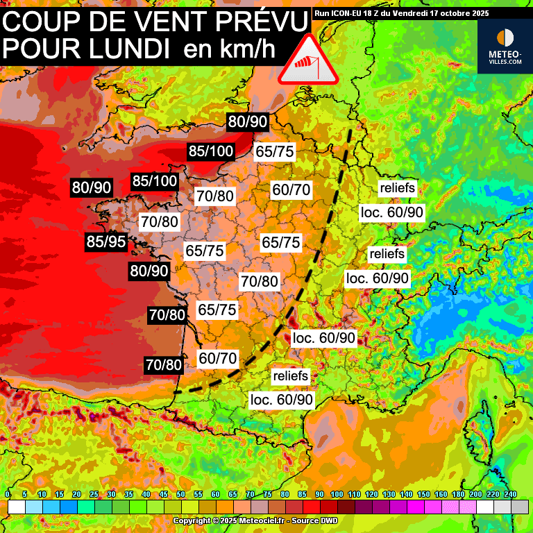 Rafales de vent maximales prévues au cours de la journée de lundi 20 octobre en France selon le modèle ICON.EU