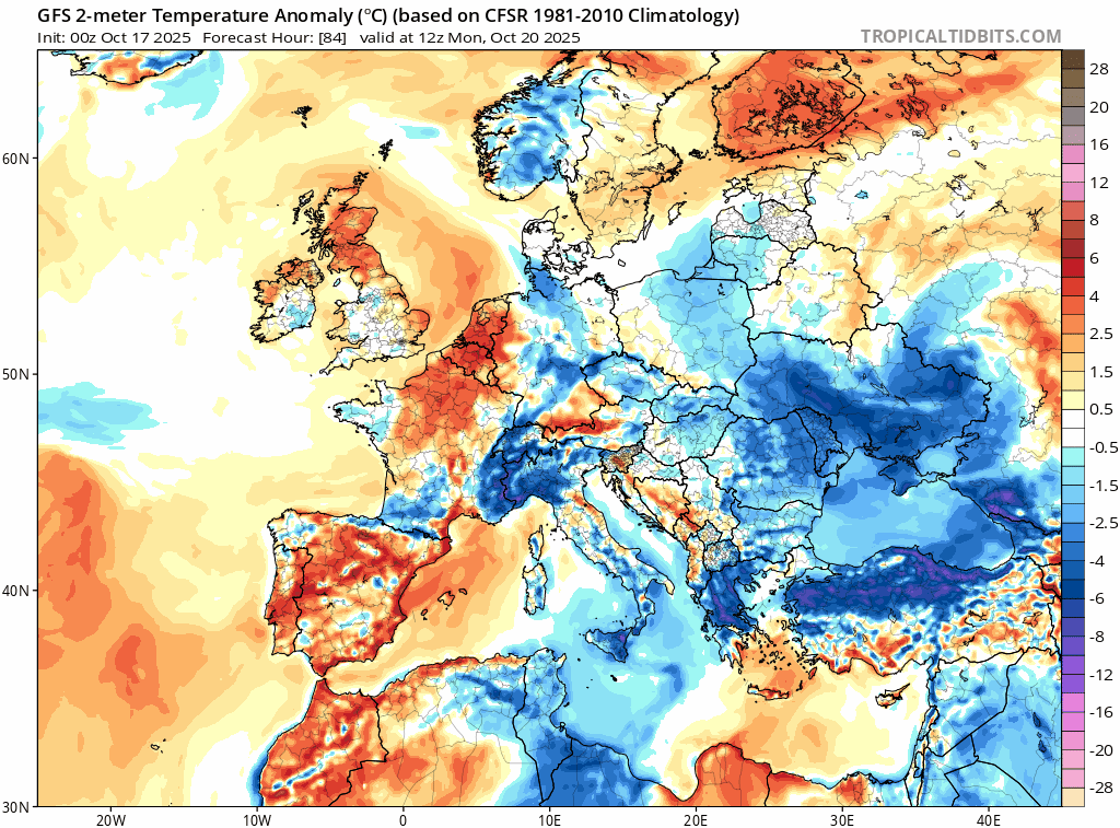 Animation des anomalies de températures à 2m sur l'Europe du 20 au 27 octobre 2025 – Via TropicalTidBits