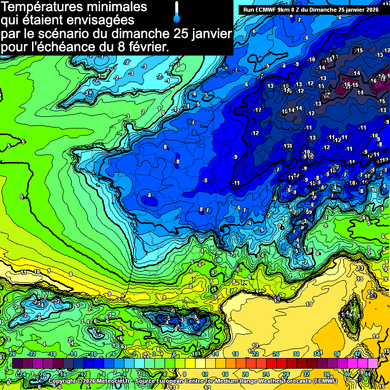 Cette carte illustre les températures prévues par le modèle européen du dimanche 25 janvier pour le dimanche 8 février, dans le cadre d’un scénario très froid.  Il est important de noter que cette carte ne doit pas être interprétée littéralement, car il s’agit du scénario le plus froid à une échéance très éloignée.  Cependant, elle suggère un potentiel de températures extrêmement basses si ce scénario se concrétisait, bien qu’il soit actuellement ultra-minoritaire.