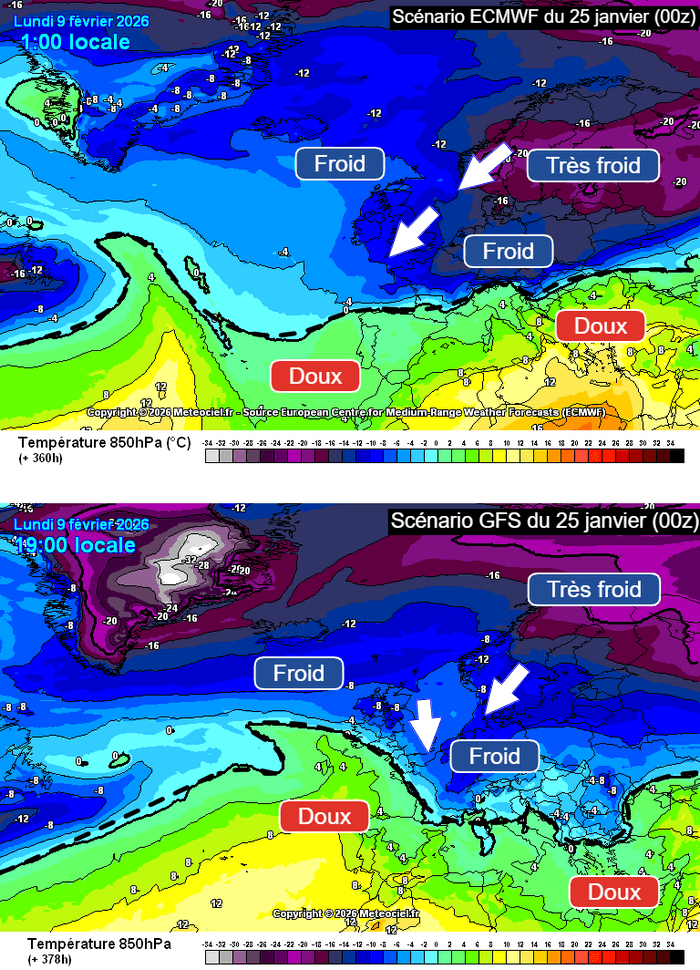 Il est donc important de noter que ces descentes d'air polaire s'étendant jusqu'à la France restent pour le moment lointains et les scénarios plus doux pourraient à nouveau l'emporter comme ce fut le cas ces dernières semaines.