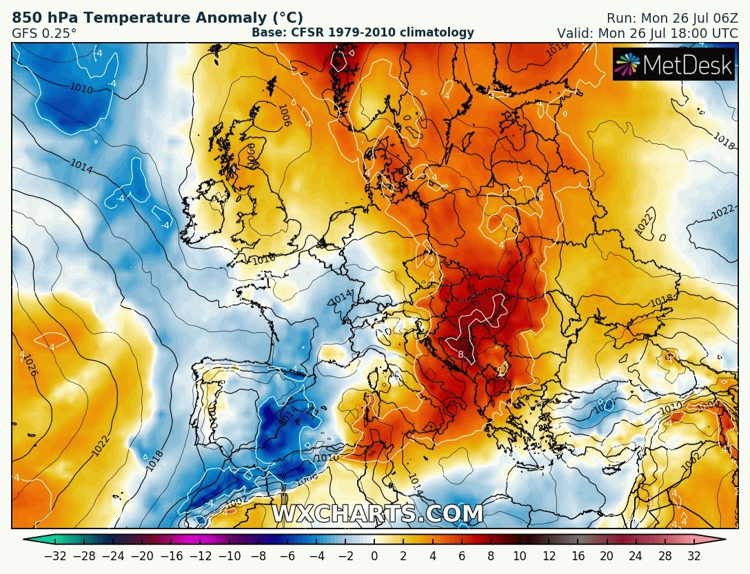 Animation des anomalies de températures à 850 hPa du lundi 26 juillet au dimanche 1er août – Modèle GFS via WX CHARTS