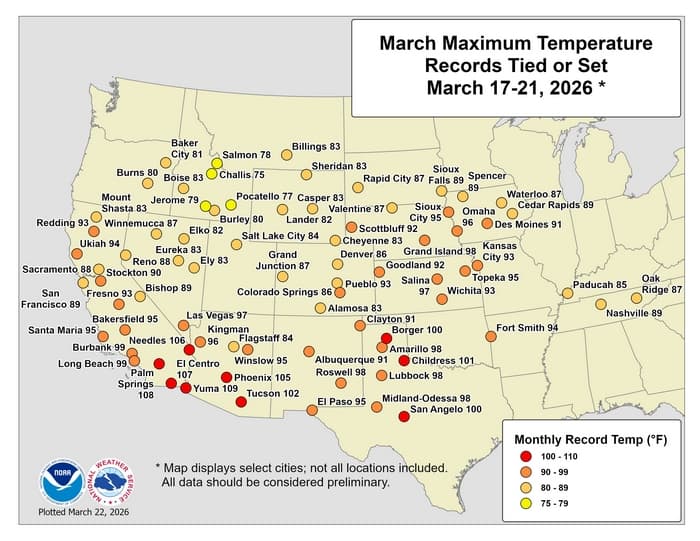 Records de chaleur battus à travers les États-Unis entre le 17 et le 21 mars 2026 – NWS