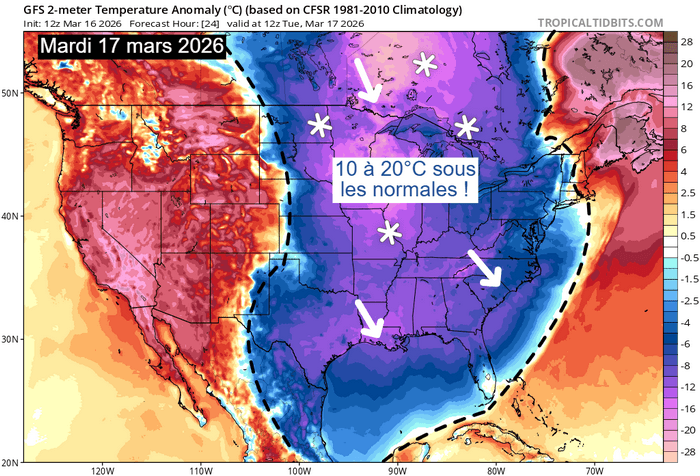Anomalies de températures sur les États-Unis le 16 mars 2026 – via TropicalTidBits