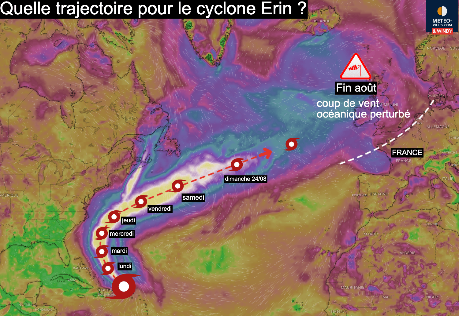 Cet épisode de beau temps pourrait prendre fin entre le 25 et le 27 août avec le retour d’un temps perturbé par l’ouest et des orages possibles. Les derniers jours d’août pourraient être perturbés en raison du cyclone tropical Erin, dont la trajectoire est incertaine.