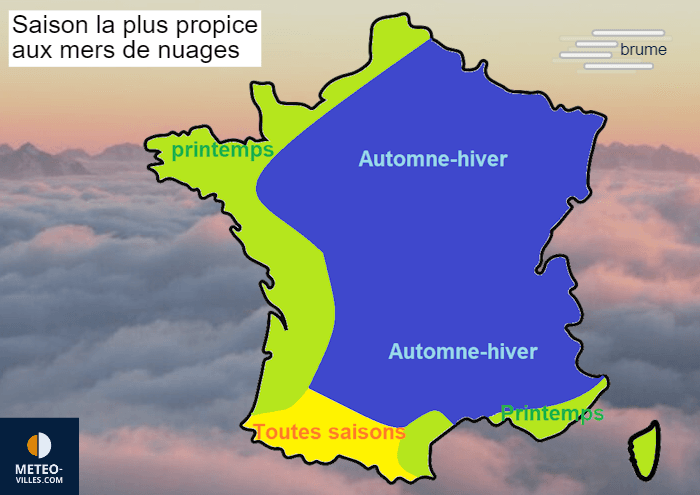 Si les mers de nuages sont possibles toute l'année, il y a des saisons bien plus favorables que d'autres à leur observation. Dans la majorité des régions de France, ce phénomène trouve son apogée entre deux mois avant et après le solstice d'hiver, lorsque le Soleil brille peu et que le sol se refroidit rapidement. Près des mers, le printemps est plus propice car l'eau est encore froide alors que l'air se réchauffe, provoquant des nuages bas, et donc des mers de nuages sur les côtes montagneuses (Pays Basque, Méditerranée, etc). Enfin, rappelons que la présence d'un anticyclone favorise grandement le phénomène.