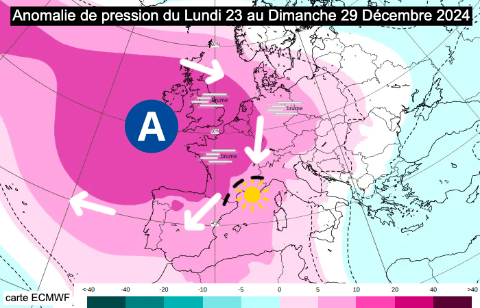 Plusieurs passages perturbés sont prévus jusqu'au lundi 23 décembre 2024. Puis, la configuration météo évoluera nettement dès le mardi 24 décembre avec une nette hausse des pressions. En effet, l'anticyclone des Açores devrait migrer vers les Îles Britanniques et la France où il devrait rester solidement ancré durant l'entièreté de la semaine prochaine. C'est donc un véritable blocage anticyclonique qui se profile.