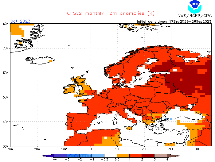 Anomalie thermique en Europe pour le mois d'octobre 2023 - modèle américain via NOAA