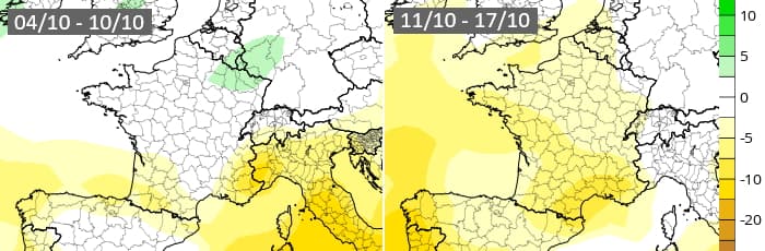 Selon ces projections, la pluviométrie pourrait donc s'avérer proche de la norme durant la première quinzaine du mois d'octobre. De légers déficits pourraient être observés dans l'ouest et le sud.