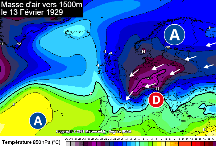 Température de la masse d'air vers 1500m le 13 février 1929 - réanalyse via meteociel.fr