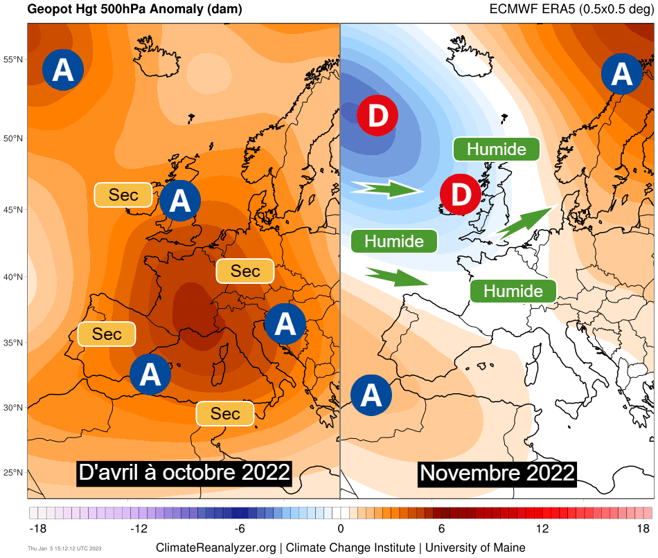 Omniprésent durant les trois quarts de l'année 2022, l'anticyclone s'est éloigné de la France durant le mois de novembre dernier, reculant vers les Açores et la Scandinavie. Les dépressions ont ainsi pu reprendre leur activité sur le nord de l'Atlantique et les Îles Britanniques, étendant fréquemment leur influence vers la France où le courant océanique perturbé a repris ses droits avec le retour de véritables pluies. Si le flux est devenu continental en première quinzaine de décembre 2022 (responsable du temps froid), le courant océanique humide et très doux domine de nouveau largement depuis plus de 15 jours.