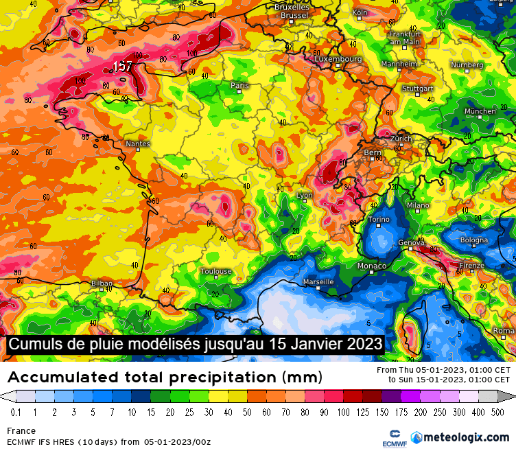 Cumuls de pluie modélisés en France jusqu'au 15 janvier 2023 - via meteologix.com