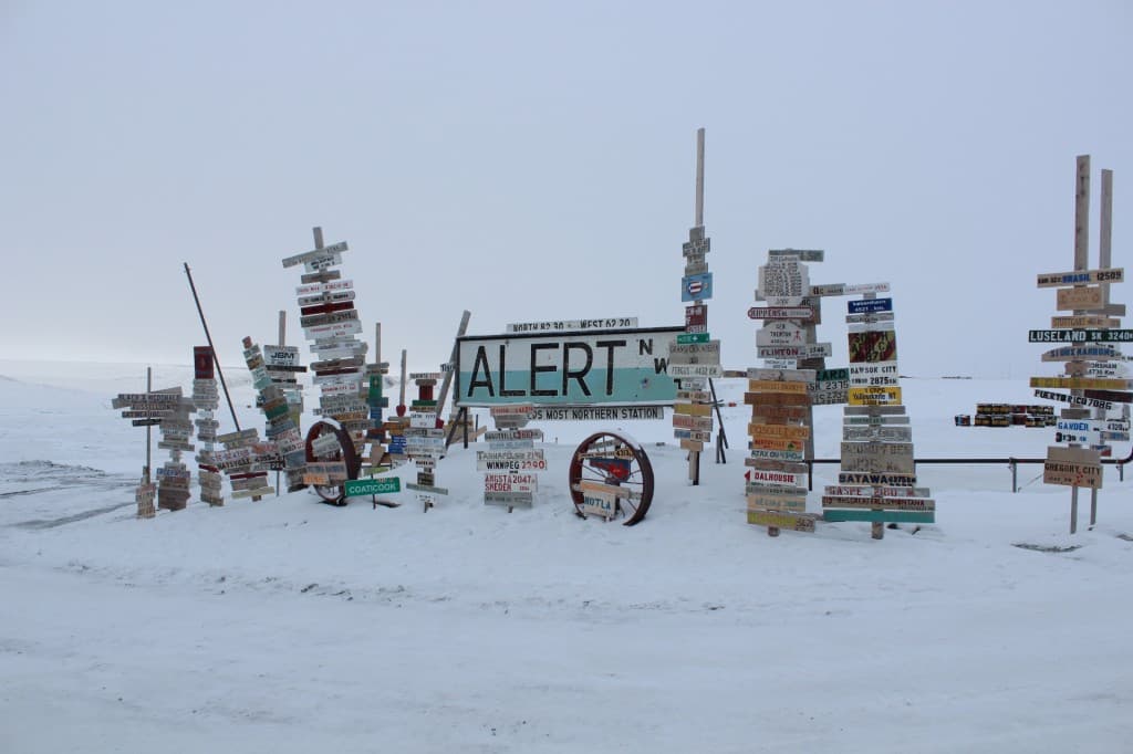 Alert, avec 82°29'55", est le lieu habité le plus au Nord du monde, situé à 817km du Pôle Nord - Il est théoriquement possible d'y voir poindre une légère lueur au Sud au solstice d'hiver (si le ciel est dégagé)