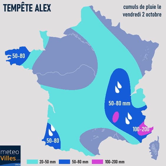 Outre les vents violents, la dépression Alex va également générer des pluies abondantes sur de nombreuses régions. Ce vendredi 2 octobre 2020, un arrosage copieux est attendu sur une grande partie de la moitié sud en remontant jusqu'à la baie de Somme avec souvent 20 à 40 mm voire 50 mm. Sur le sud de l'Aquitaine, l'ouest de la Bretagne et le sud-est du pays, les cumuls pourront atteindre 50 à 80 mm.
