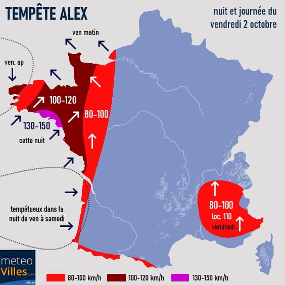 Notons que le décalage du coeur de la dépression Alex vers la Charente-Maritime devrait générer des rafales tempétueuses sur le littoral aquitain en seconde partie de nuit de vendredi à samedi (100 à 110 km/h voire 120 km/h sur les littoraux les plus exposés).