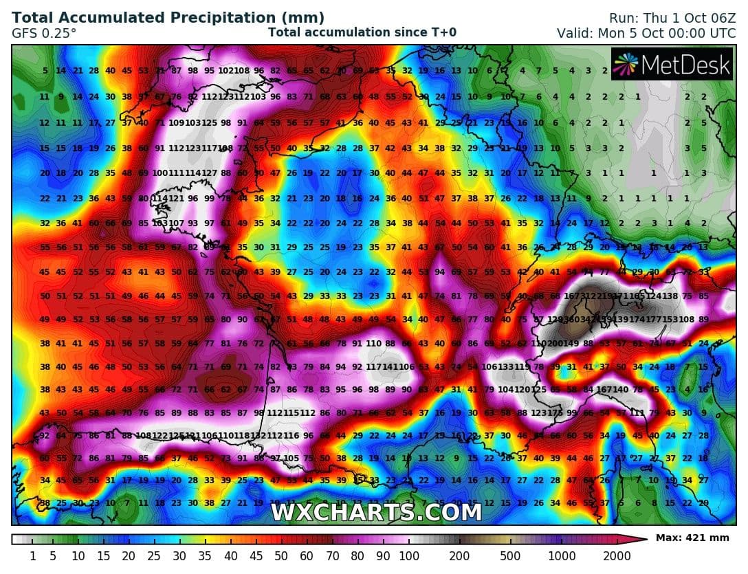 Modélisation des cumuls totaux de précipitations d'ici le dimanche 4 octobre 2020 au soir - via wxcharts.com