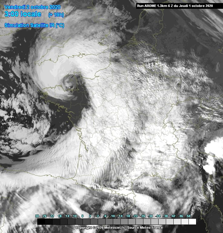 Simulation satellite montrant le coeur de la dépression Alex le 2 octobre 2020 à 3h - modèle AROME via meteociel.fr
