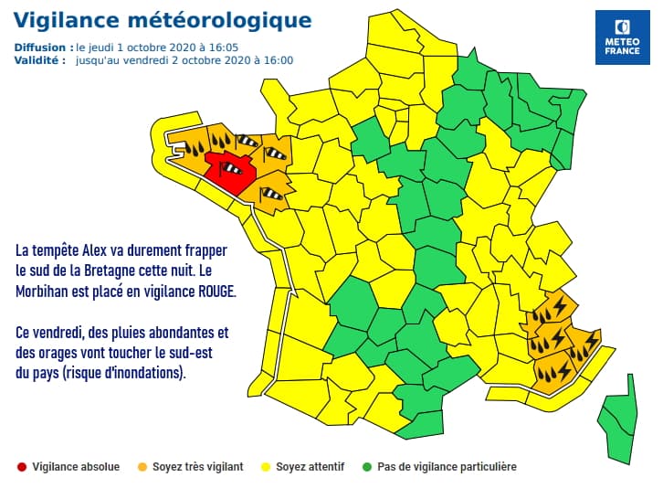 Face aux vents violents que va générer la tempête Alex, Météo France a placé le département du Morbihan en vigilance ROUGE ! Les départements des Côtes-d'Armor, de l'Ille-et-Vilaine et de la Loire-Atlantique sont quant à eux concernés par une vigilance de niveau orange. Par ailleurs, Morbihan, Côtes-d'Armor et Finistère sont aussi en vigilance orange pour de forts cumuls de pluie.