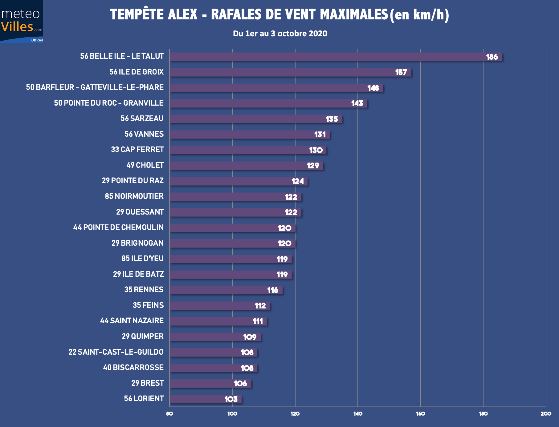 Voici le récapitulatif des plus fortes rafales de vent observées sous cette première tempête de la saison 2020-2021, entre le 01 et le 03 octobre 2020.