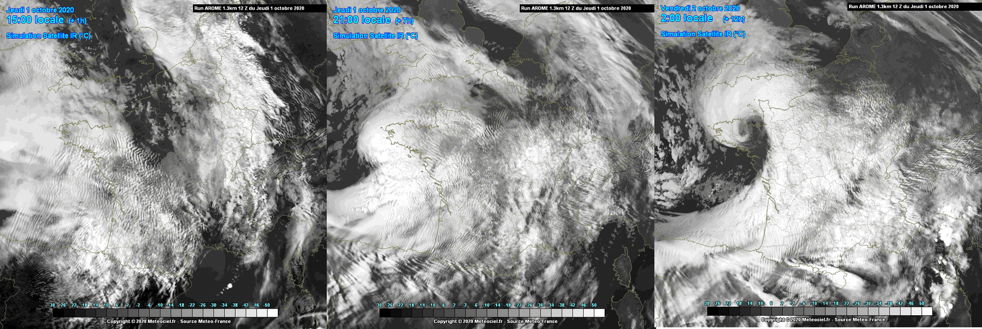 Evolution du creusement de la tempête Alex entre jeudi 01/10 15h00 et vendredi 02/10 02h00 - Modèle arome via Météociel.fr