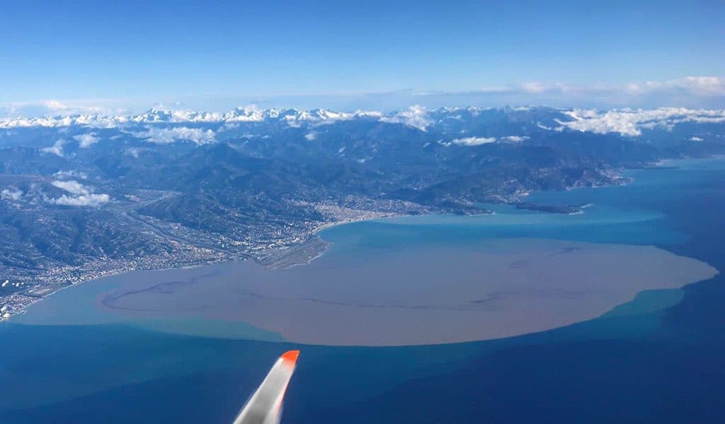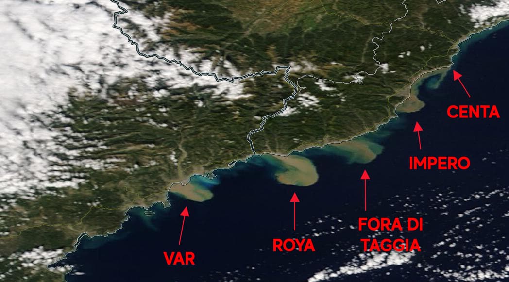 Avec tant de sédiments, boues et débris arrachés lors de ces crues, les embouchures des différents fleuves bordant les Alpes-Maritimes ainsi que la Ligurie ont pris une tente marron lors du déversement dans la Méditerranée. Ceci est notamment visible depuis l'espace !