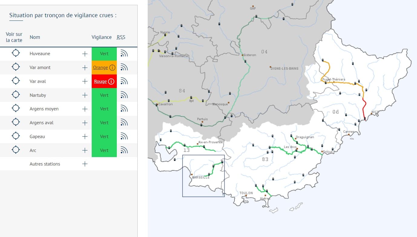 A 06h00, Météo-France plaçait d'ores et déjà un bon nombre de départements du Centre-Est du pays en vigilance pour un risque de pluies/inondations. Les Alpes-Maritimes ont quant à eux été placées en vigilance rouge en raison des très importants cumuls de pluie attendus (cumuls voisins de 50 à 80mm de la Côte d’Or au Nord des Alpes, entre 150 et 250mm (loc. 450mm) de l’Est-Var à la frontière Italienne).