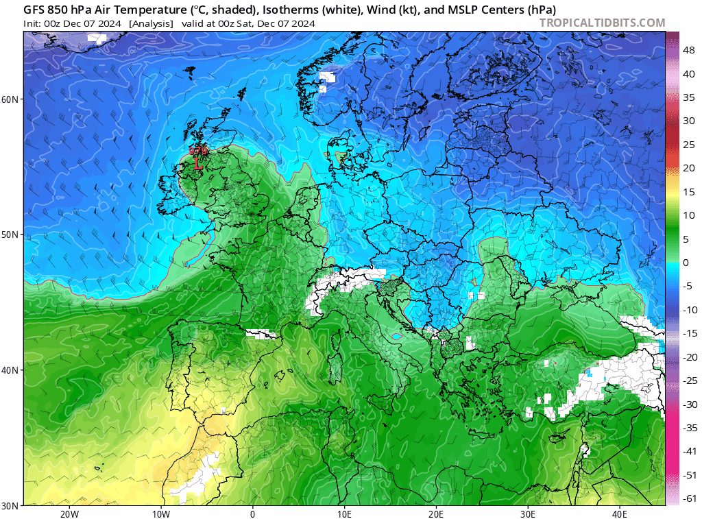En revanche, à des altitudes plus basses, la masse d'air se réchauffe sensiblement lors de son passage au-dessus de l'Atlantique Nord et des mers européennes.