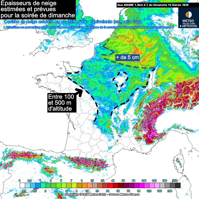 Épaisseurs de neige maximales prévue pour le dimanche 15 février 2026 (réactualisation de dimanche 6h) – Météo-Villes