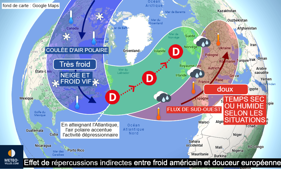 Schéma montrant l'effet de répercussions indirecte entre froid américain et douceur européenne - Météo Villes