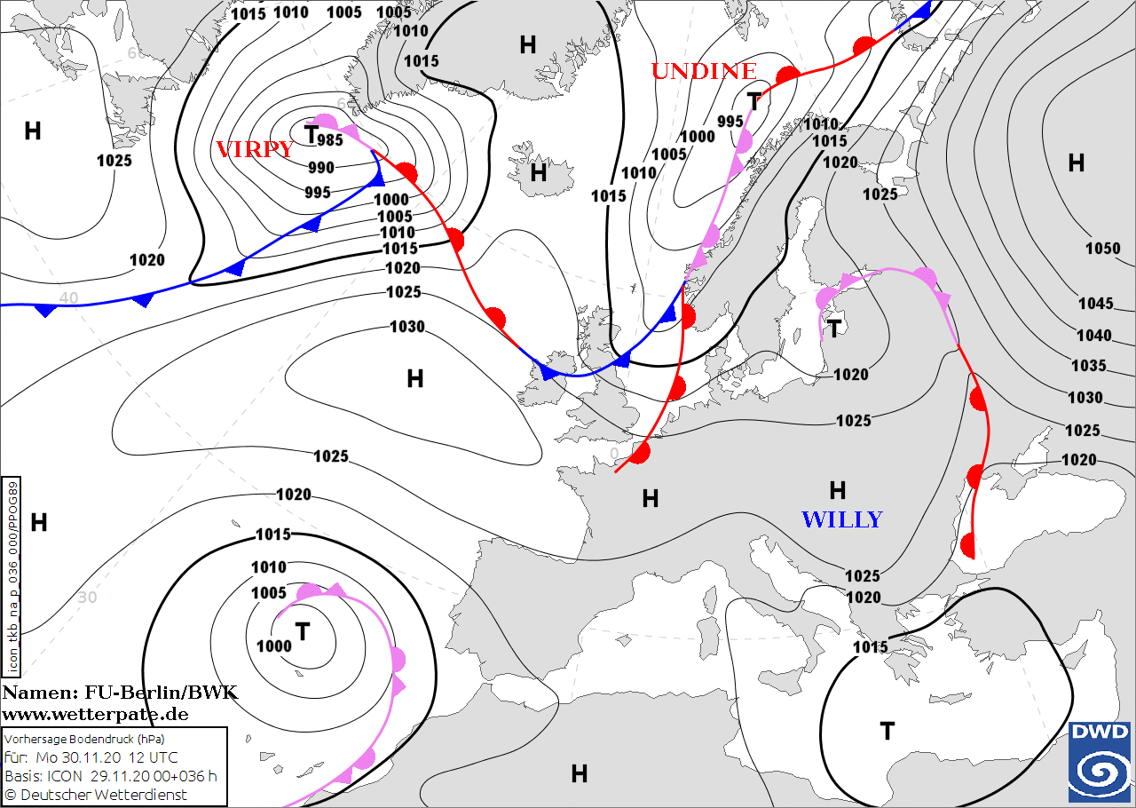 Noms des dépressions et anticyclones prévus pour lundi 30 novembre 2020 à midi (Berlin)