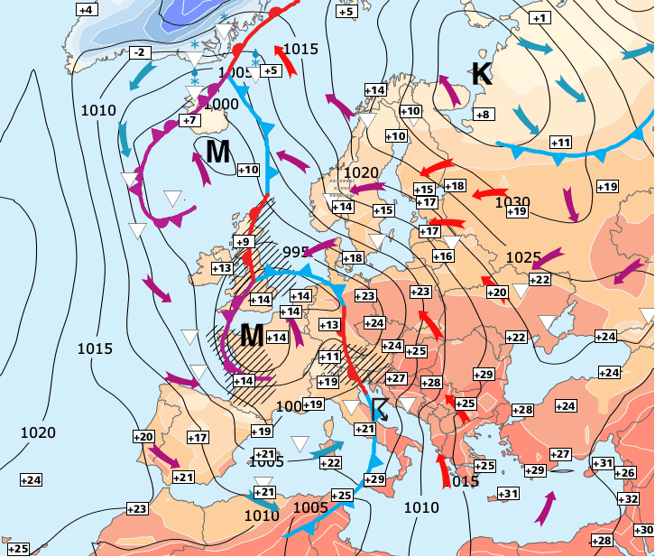+ L’anticyclone des Açores reviendra toutefois protéger une partie des régions du Sud entre mercredi et surtout jeudi, puis de l’air plus frais pourrait nous influencer le week-end prochain.