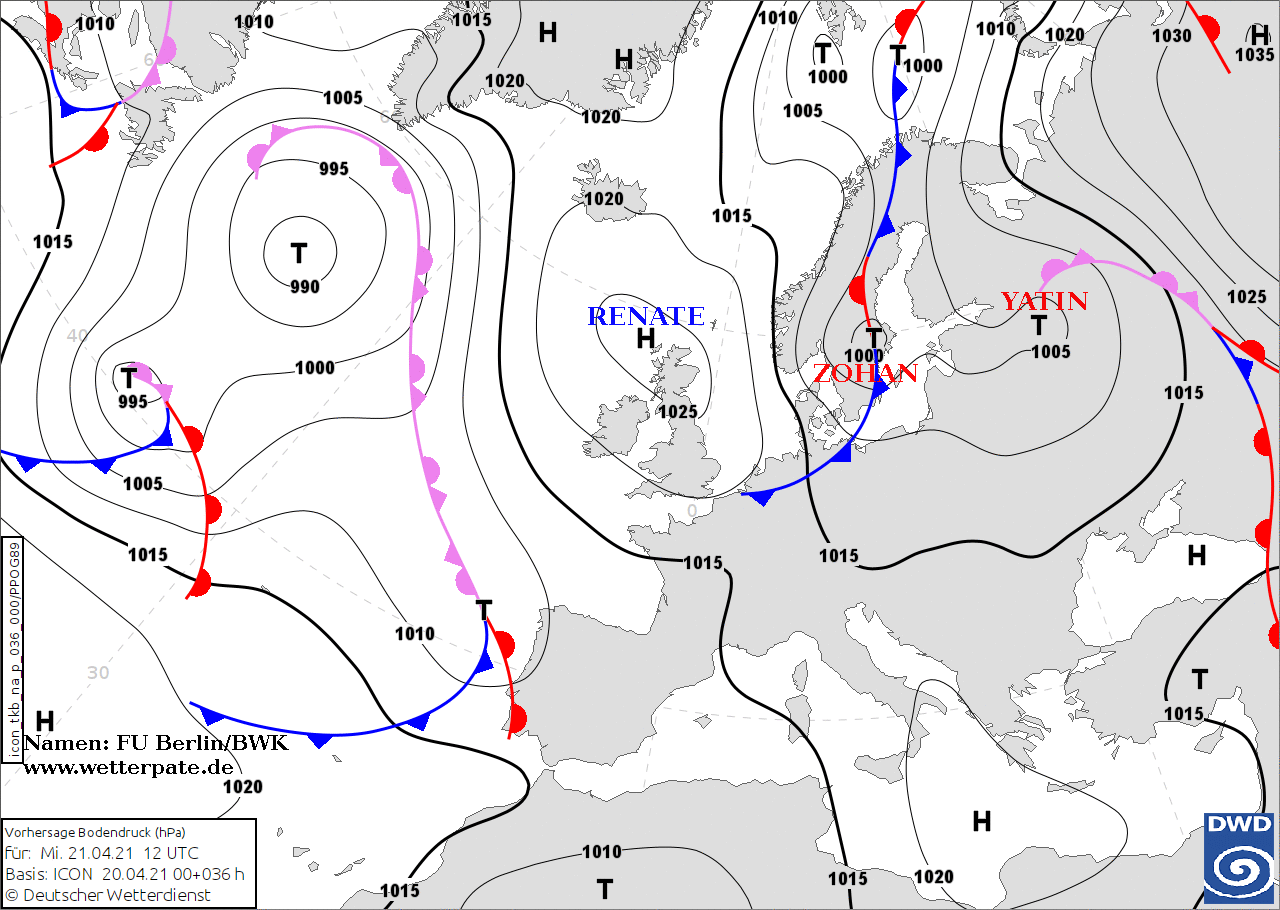 Noms des dépressions et anticyclones prévus pour mercredi 21 avril 2021 à midi (Berlin)
