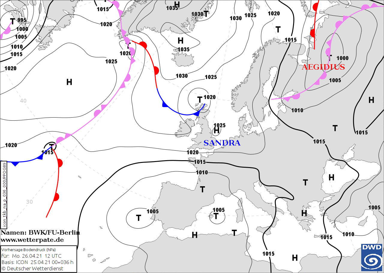 Noms des dépressions et anticyclones prévus pour lundi 26 avril 2021 à midi (Berlin)