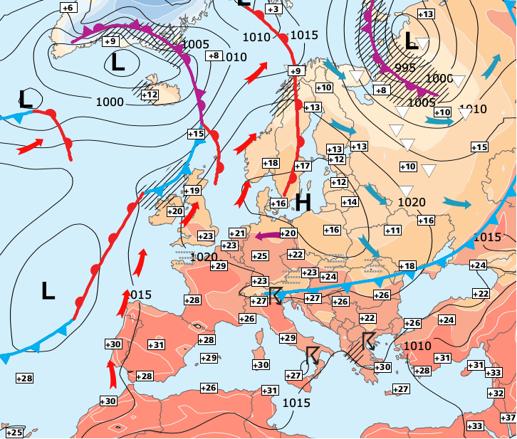 + A partir de mercredi, de l’air océanique un peu moins chaud et instable occasionnera quelques orages dans l’Ouest, puis vers d’autres régions.