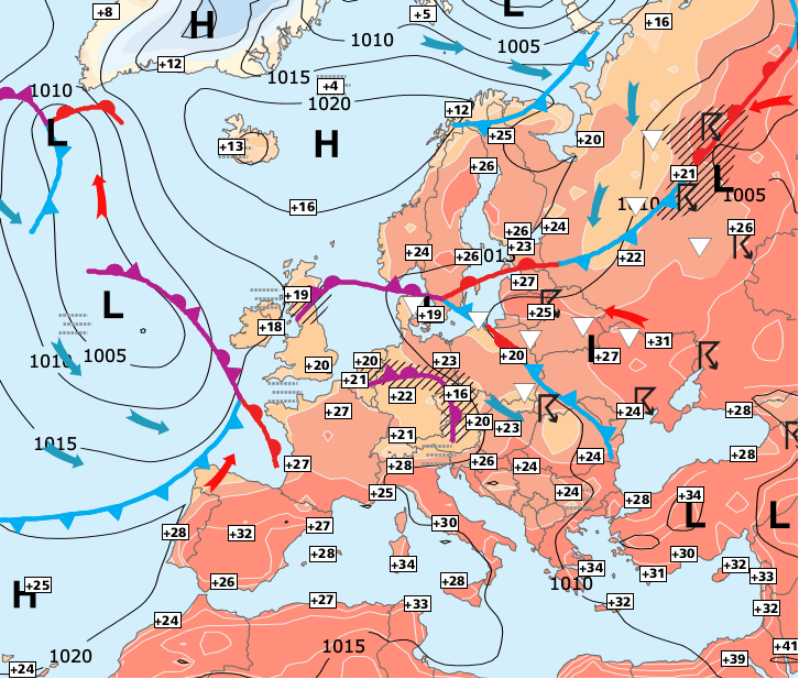 + Pour que le temps redevienne durablement stable et estival sur toute la France, la Belgique et la Suisse, il faut que le centre de l'anticyclone des Açores remonte vers les Iles britanniques, puis l'Allemagne. Et nous ne serons pas dans cette configuration avant la 2eme quinzaine de juillet.