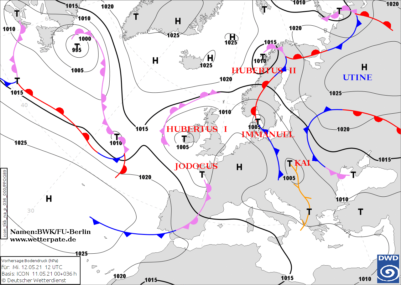 Noms des dépressions et anticyclones prévus pour mercredi 12 mai 2021 à midi (Berlin)