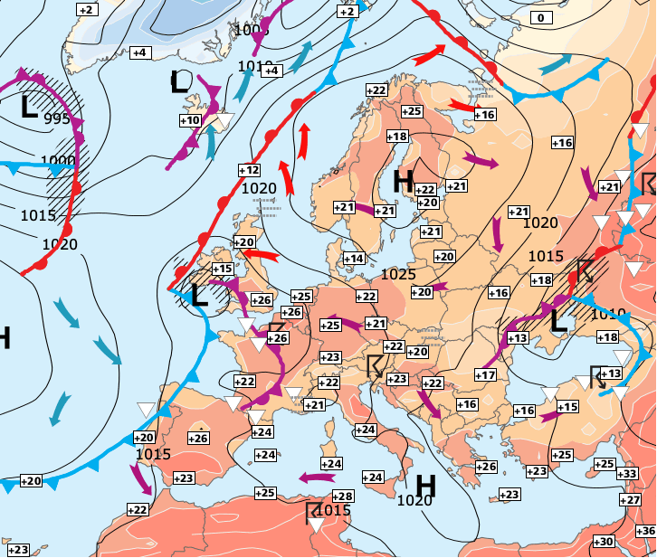 + Vendredi : Les orages seront plus fréquents entre les Pyrénées, la Belgique et les régions du Nord-est (en limite du conflit entre l’air frais océanique et l’air chaud remontant de Méditerranée).