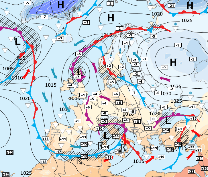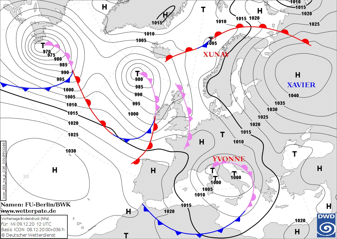 Noms des dépressions et anticyclones prévus pour mercredi 9 décembre 2020 à midi (Berlin)