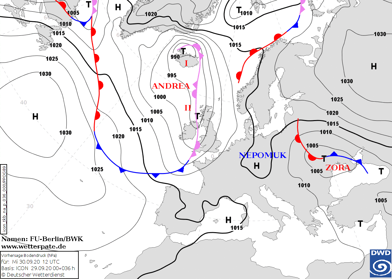 Noms des dépressions et anticyclones prévus pour mercredi 30 septembre 2020 à midi (Berlin)