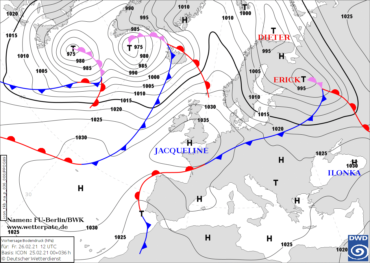 Noms des dépressions et anticyclones prévus pour vendredi 26 février 2021 à midi (Berlin)