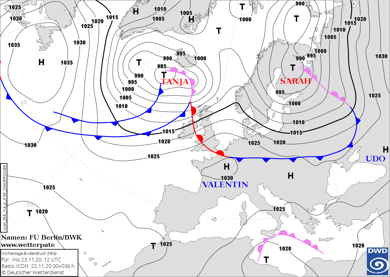 Noms des dépressions et anticyclones prévus pour lundi 23 novembre 2020 à midi (Berlin)