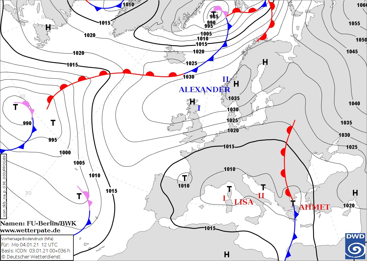 Noms des dépressions et anticyclones prévus pour lundi 4 janvier 2021 à midi (Berlin)
